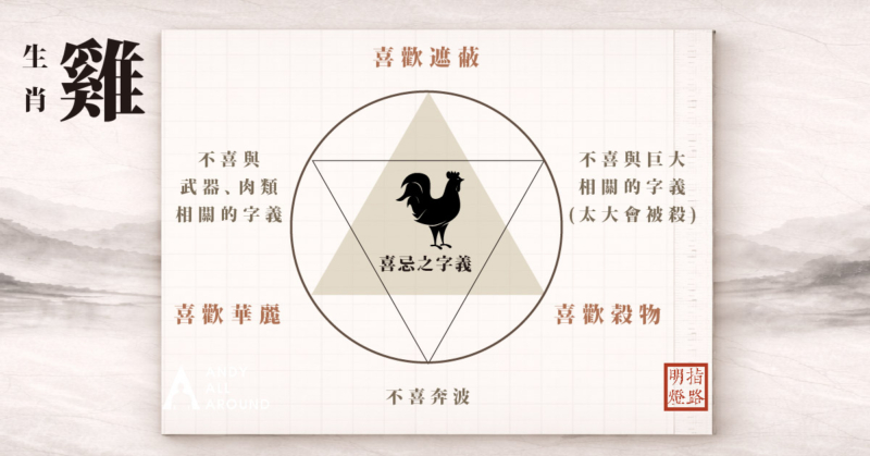 屬雞之人不宜有肉字邊、不喜見人字邊、或見二個太陽(日)、或有奔跑交叉等字形、遇兔字形成六沖、遇狗字形成六害、遇武器字形怕被傷害-如果名字中有以上所舉例之字形就表示名字有破格。
