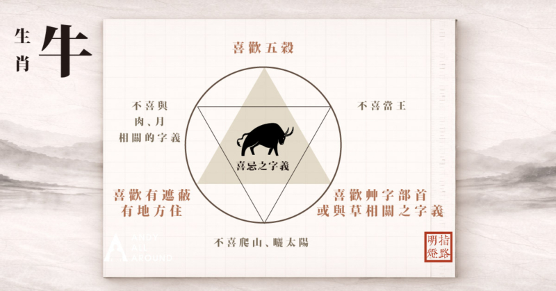 牛喜歡有洞穴住、喜吃五穀、如能得水得木得草最佳、得蛇得雞成三合局、得鼠得豬成三會局、得田符合屬性、得柵欄得休息-名字中如有符合下述條件者為好名。