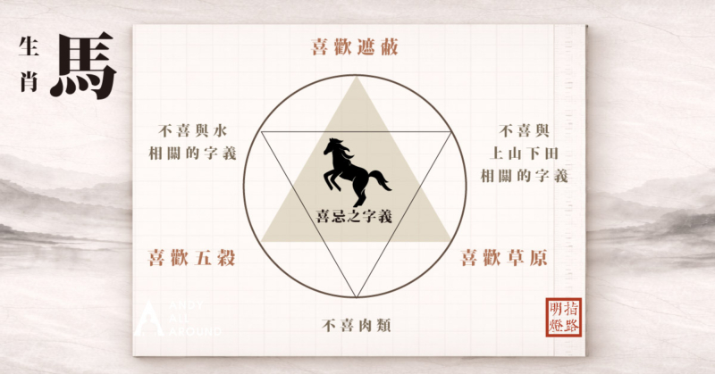 屬馬之人不宜有肉字邊、碰到老鼠成六沖、遇牛則成六害、遇水字形則成水火相剋,最好不要見山會太勞累-如果名字中有以上所舉例之字形就表示名字有破格。