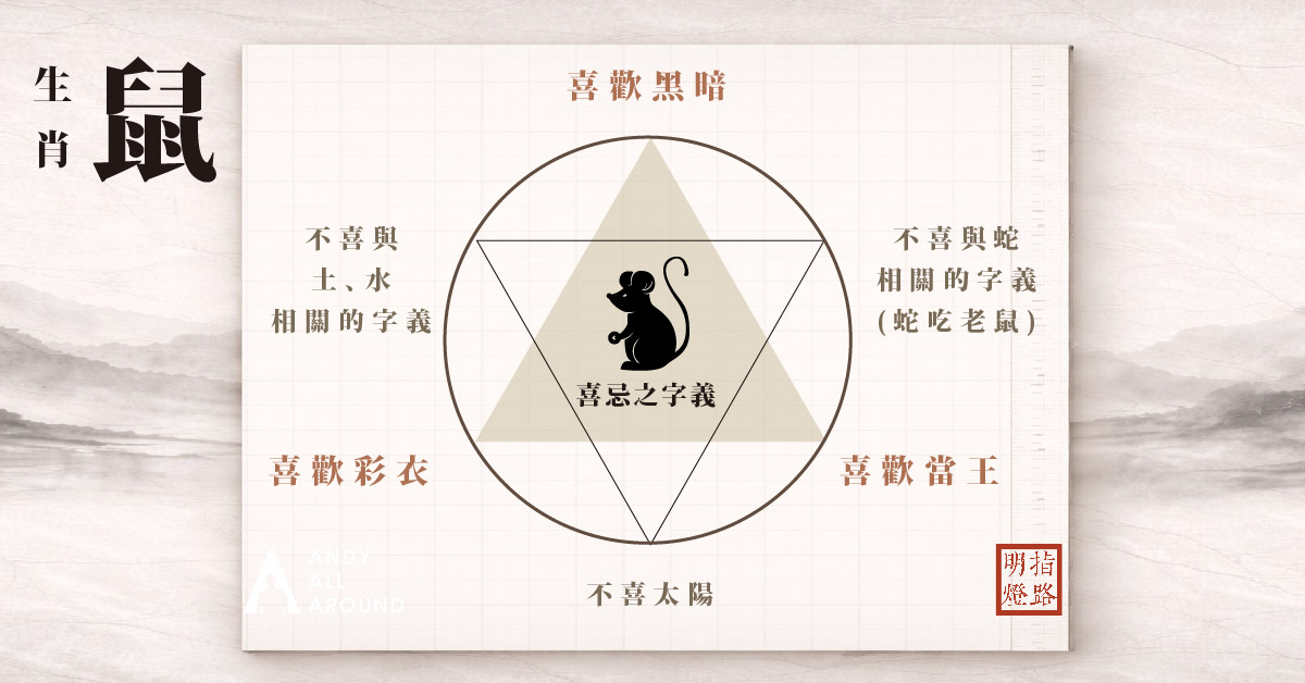 屬鼠之人不喜歡字有人字邊就像(過街鼠,人人喊打)、避免有火字形因(水火不容)、避免有馬字形(子午正沖)、避免有羊字形(鼠羊相遇一旦休)、避免有奔跑字形 (逃命)、避免有太陽字形(不喜歡見日)-如果名字中如有以上所舉例之字形就表示名字有破格。